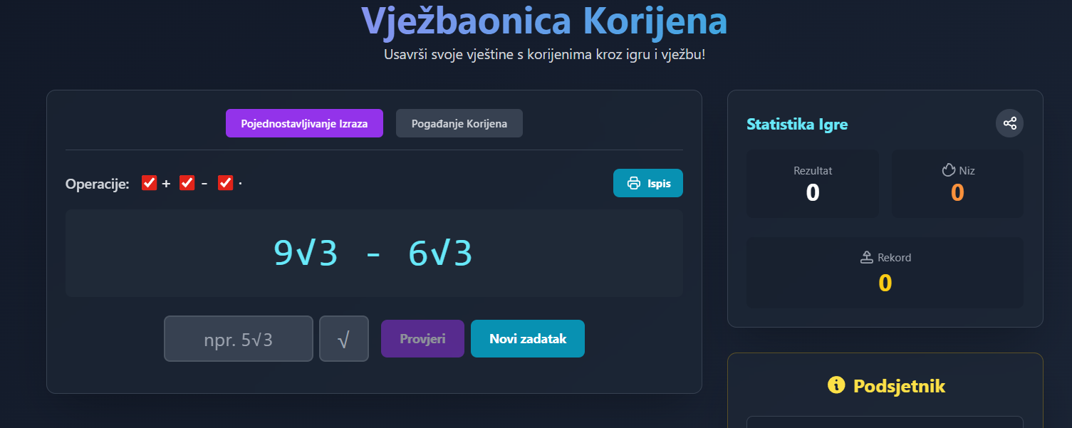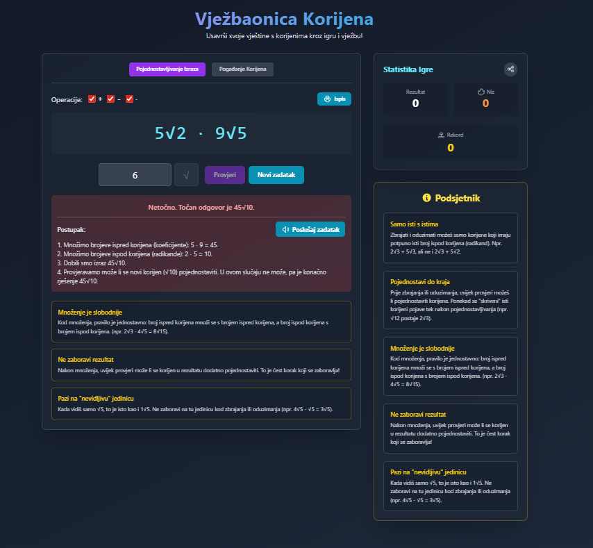Razgovor sa prijateljem me motivirao da napravim Vježbanicu Korijena. Nije revolucionarna aplikacija. Nije najmodernija. Ali je — za razliku od većine AI alata — fokusirana na jednu stvar: