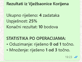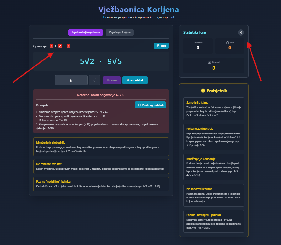 Desna strana: Statistika — koliko ste zadataka riješili, koliko propustili, što ste naučili.