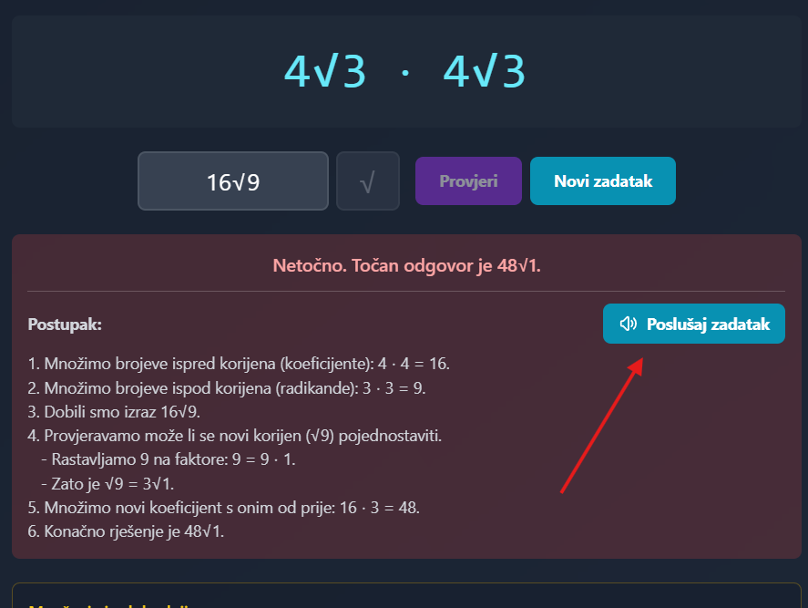 5. Naučite iz toga — viđate sve korake koji vode do odgovora. Nije samo “odgovor je 45√10”. Već: “5 · 9 = 45, √2 · √5 = √10, kombiniramo = 45√10.”
